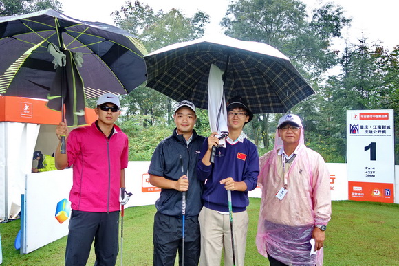 【golftime讯】平安银行中国美巡赛·重庆·江南新城·庆隆公开赛,10月17日在清晨小雨和轻雾中按时开球,在一号洞担当中英双语出发员的是球场总经理陈俭良先生。为了这个赛事夜以继日工作了几个月的陈总,在发球台上终于有时间可以跟多年来认识的中国选手致意和为他们唱名出发。 (摄影/报道:golftime·青山绿水)
