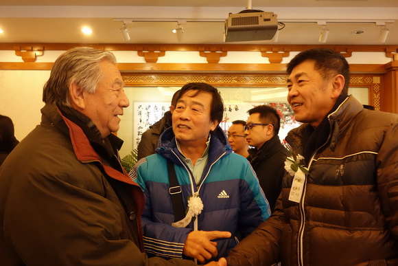 新华社高级记者杨明(右)、北京晚报资深体育记者刘永广与赵书田相遇寒暄。