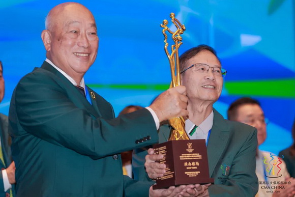 在欢迎晚宴上,总联会联合创始人、第二届总联会承办球会昆明春城湖畔度假村时任总经理杨辉光先生为本届年会承办球会海峡奥林匹克高尔夫俱乐部颁发纪念奖杯,担任俱乐部总经理的罗政雄先生作为球会代表接过了这份沉甸甸的荣誉。