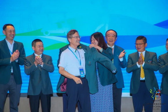 在总联会联合创始人、第二届总联会承办球会昆明春城湖畔度假村时任总经理杨辉光先生,第五届总联会承办球会上海旭宝高尔夫球会时任常务副总经理黄沧江先生,第八届总联会承办球会博鳌亚洲论坛BFA高尔夫球会时任总经理刘炳和先生,第十一届总联会承办球会天津松江团泊湖高尔夫俱乐部时任总经理王清明先生,第十五届总联会承办球会石岛旅游休闲度假区高尔夫俱乐部时任总经理王东先生,第十六届总联会承办球会天津27人俱乐部时任董事长王月先生,第十七届总联会承办球会庐山国际高尔夫球会总经理喻湘闽先生、董事长凌云先生等多位历届总联会承办球会的总经理和业主的现场见证下,第二十届总联会承办球会广州南沙高尔夫球会常务副总经理林春阳女士为海峡奥林匹克高尔夫俱乐部总经理罗政雄先生穿上象征传统与胜利,并印有年会会徽的绿夹克!