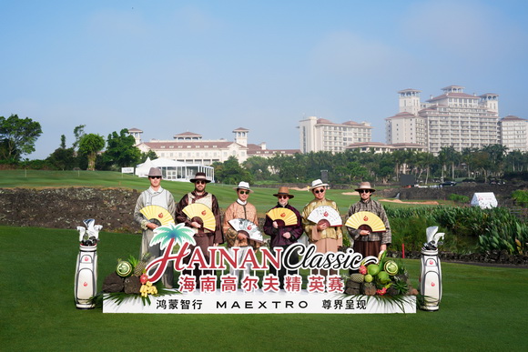 清晨八点的阳光刚刚越过树梢,洒在海口观澜湖黑石球场18号洞的果岭上。参加本届赛事的球星代表与嘉宾齐聚一堂,拍摄赛事官方开幕照。与往年不同的是,今年大家换上了传统中式长袍,在火山岩球场的映衬下,东方神韵与高球优雅相得益彰。
