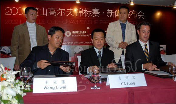 【golftime讯】2009麓山高尔夫锦标赛新闻发布会4月8日在北京举行,中高协与世界体育集团和麓山球会共同出席并宣布,这场2009年第三站欧米茄中国巡回赛,6月11-14日在成都麓山国际乡村俱乐部举行,赛事总奖金1000万人民币,是麓山连续第二年冠名成都赛事。出席发布会的嘉宾有:国家体育总局小球中心副主任王立伟、四部副部长庞政、成都麓山国际乡村俱乐部总经理方楚文、世界体育集团高尔夫东亚区副总裁雷蒙和去年成都站卫冕冠军蔡启煌。 (摄影/报道:golftime·阿沛)