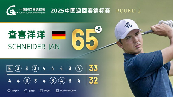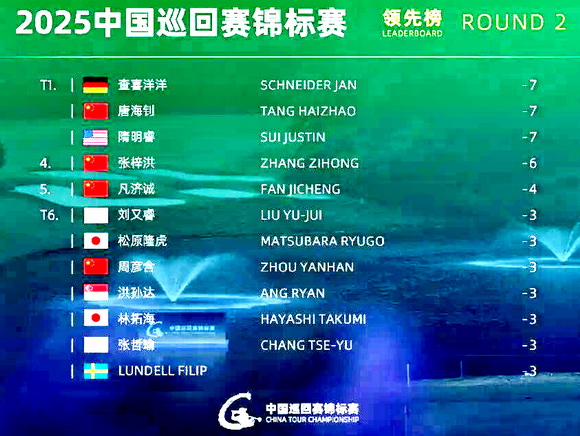 【golftime讯】北京时间2025年12月19日,2025中国巡回赛锦标赛,在广州南沙高尔夫球会进入次轮争夺。中国球员唐海钊、德国球员扬·施耐德(Schneider JAN,中文名查喜洋洋)与美籍华裔球员隋明睿(Justin SUI)均交出总成绩-7杆,以两杆优势并列领跑积分榜;中国球员张梓洪以-6杆紧随其后位居第四,全场竞争陷入白热化,为后两轮轮对决埋下重重悬念。