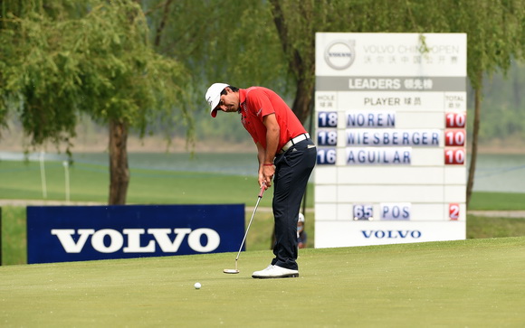 【golftime讯】第22届沃尔沃中国公开赛4月29日在北京怀柔通盈·雁栖湖高尔夫俱乐部展开了第二轮的争夺。比赛由于雷雨天气于下午15时50分暂停,尚有79名选手没有完赛。世界排名477位的智利选手菲利普-阿奎拉(Felipe Aguilar)第二轮交出65杆,总成绩133杆(68、65)-11暂时取得会馆领先。瑞典选手亚力克斯·诺伦(Alex Noren)、奥地利选手贝恩德·维斯伯格(Bernd Wiesberger)总成绩134杆-10,以1杆之差排名并列第二位。韩国选手金泰勋、英格兰选手泰瑞尔·哈顿(Tyrrell Hatton)、丹麦选手卢卡斯·毕雅格(Lucas Bjerregaard)总成绩低于标准杆9杆并列排在第三位。另外,首轮领先的南非选手亨尼-奥托(Hennie Otto)以及德国名将马塞尔-西姆(Marcel Siem)尚未完成比赛,目前总成绩为-9。目前比赛的预计晋级线为低于标准杆2杆。