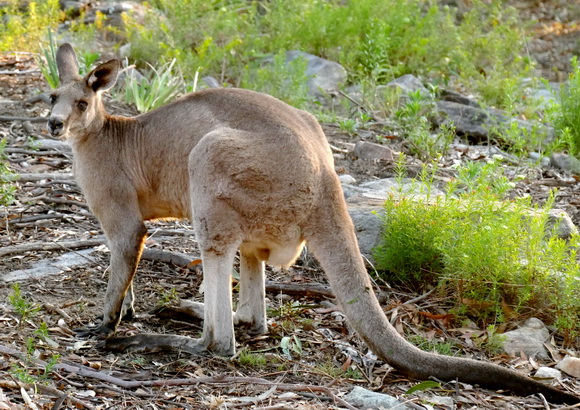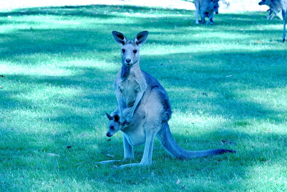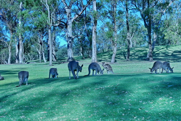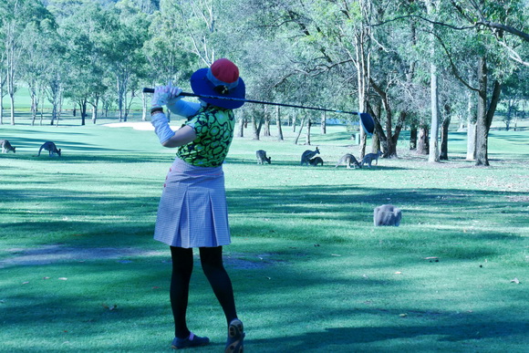 最有趣的是,懒一些的袋鼠就斜卧在草地上,头向旁边一歪,就够到要吃的草;年轻一些的雄袋鼠,不甘于只是吃吃喝喝,还两两对决找碴打架,它们面对面而站立,用两个前爪互相拍打,但是都把头仰向侧后方,激烈逗打的时候根本看不见对方,也不知道它们是怎么确定击打对方的目标的。打急了就上蹄子踹对方,每一次都是这一个先踹一下,那一个再踹一下。打累了就歇下来继续吃草,然后想起来就又噼噼啪啪乱打一通。着实令人引俊不禁笑个不停。更可乐的是,它们也不躲闪球友,考察团中的一个媒体朋友像中标了一样,开球打中了球道上的灰袋鼠,他还戏谑地说,要给袋鼠上药去。