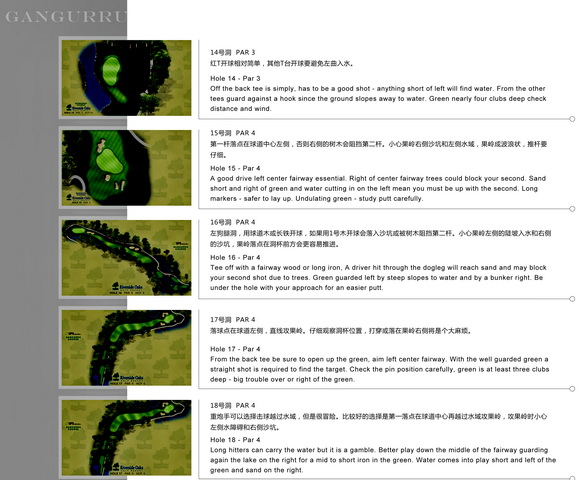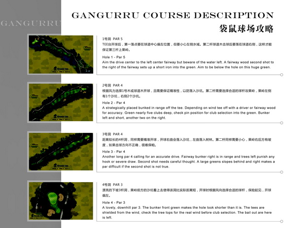 灰袋鼠球场Gangurru是18洞标准杆72杆的锦标赛球场,全长6311米,一直稳居澳洲前100名公共高尔夫球场之列。完美的设计,宽阔的果岭和世界级设施打造了一个悉尼最顶尖的高尔夫度假村球场。特别是近期经过沙坑的翻新和新增的几处沙坑,又给球场赋予新活力;果岭和球道的品质也有大幅度的提升,这些改进无疑让球场再次成为澳洲最出色的公共球场之一。