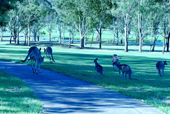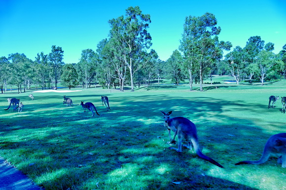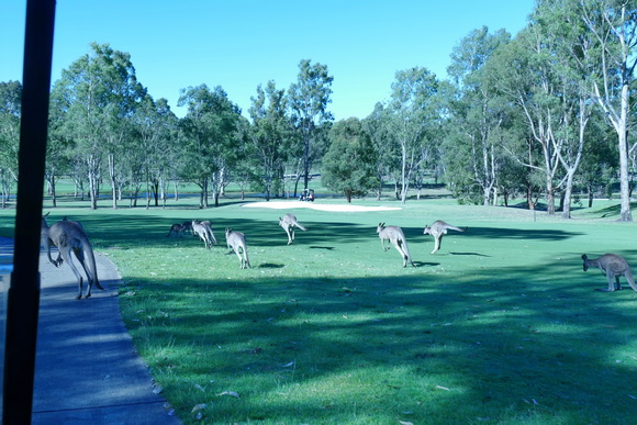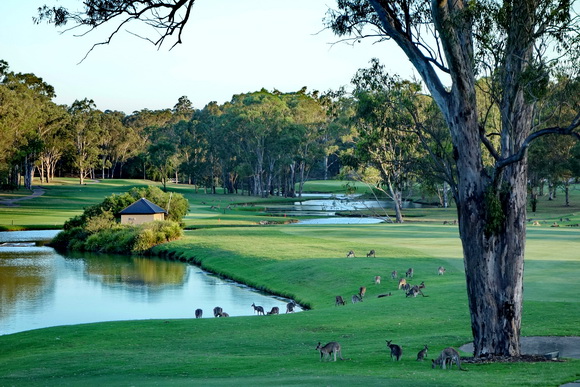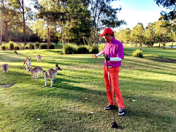 最近微信朋友圈里有一个视频火了,澳洲袋鼠成了网红,它因为在锁喉狗狗,被身高力大的澳洲男人冲上去抽了一个大嘴巴,它被人打后踉跄了一下仿佛懵圈了一般,不知所措的呆在那里,然后好像被打它的人骂得吓坏了赶忙掉头逃窜,让人看了笑出眼泪。好在橡树河谷高尔夫度假村球场里的袋鼠都还比较胆小,不是太敢靠近球友,在球场里打球遇到它们还是很安全滴。