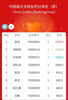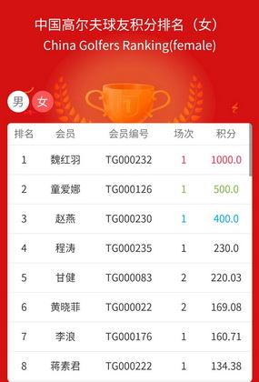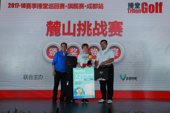 在男女混赛的情况下,女冠军的出现是非常不容易的,魏红羽的出现让人不禁对捶堂巡回赛女参赛者们的表现很是期待。在颁奖晚宴上,成都麓山国际高尔夫乡村俱乐部总经理方楚文先生与北京微动空间传媒有限公司董事长吕粮先生为捶堂巡回赛第一位女冠军颁发了丰厚的奖励,分别是比奇漢球包、三菱重工空调提供的车载MISORA空清机、源参缘珍味食品,以及汉王科技提供的E典笔,而她也将获得捶堂巡回赛旗舰赛冠军独享的1000分积分,位于CGR女子排名第一位。不得不说,这个第一位可能很难被超越。