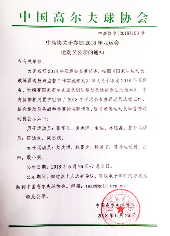 各有关单位: 为完成好2018年亚运会参赛任务,按照《国家队运动员、教练员选拔与监督工作实施细则》和《关于印发2018年亚运会、世锦赛国家高尔夫球集训队运动员选拔办法的通知》,中高协按相关要求组织了2018年亚运会参赛运动员选拔工作,结合运动员备战和参赛的实际情况,现将参赛运动员和替补运动员公示如下: