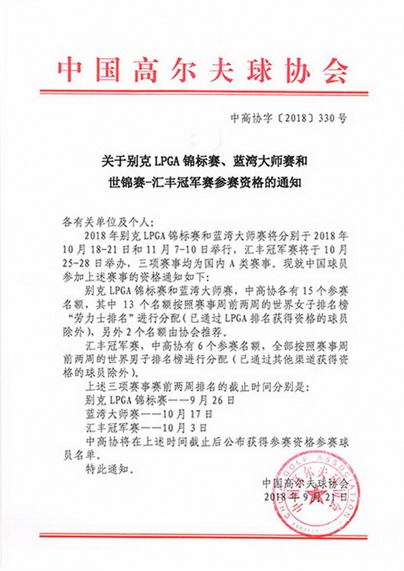 关于别克LPGA锦标赛、蓝湾大师赛和世锦赛-汇丰冠军赛参赛资格