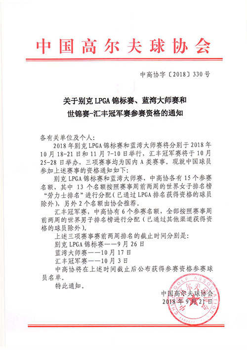 关于别克LPGA锦标赛、蓝湾大师赛和世锦赛-汇丰冠军赛参赛资格的通知