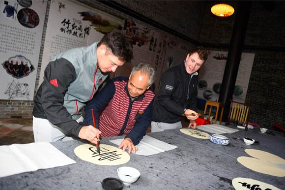 来到这里,四位球员脚踏青石小路,感受脉脉书香,体会古村的深长韵味。随后,他们在书法大师的指导下,临摹书法。当看到他们用毛笔书写出像模像样的中国字后,书法大师表示非常欣慰。