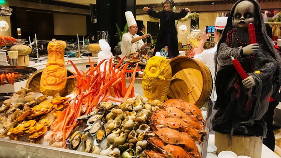 闪烁的灯光之间,琳琅满目的食物铺成开来,13款美食现场烧烤:生蚝,大虾,龙利鱼,肉眼扒,猪扒等再配以4款厨师秘制汁酱搭配宠溺你的味蕾;9款万圣节元素甜品惊艳你的眼球;每人一杯万圣节特调鸡尾酒“吸血鬼Only”绝对让你回味无穷!