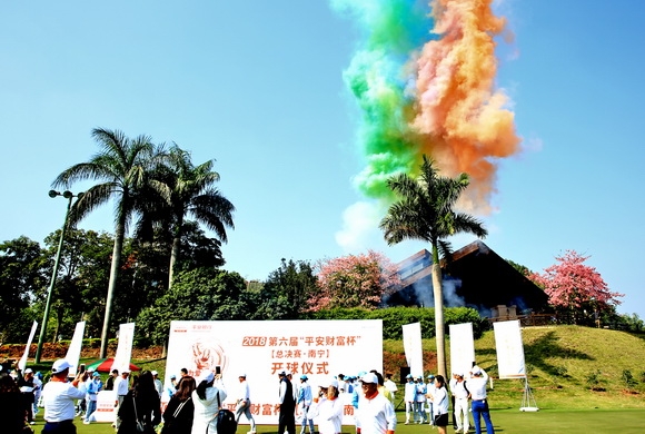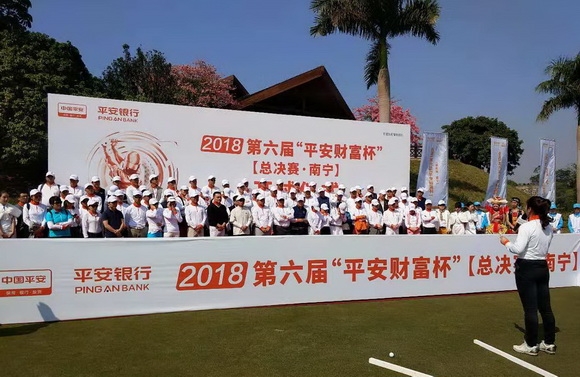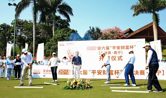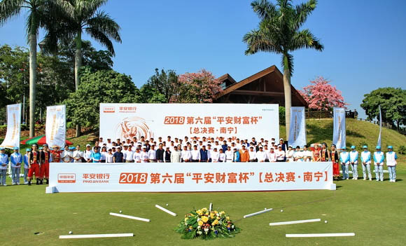 【golftime讯】平安银行一年一度的高球文化经典赛事,暨2018“平安财富杯”高尔夫邀请赛,在平安银行各分行举办了27场分站赛后,来自中区、北区、南区三大片区各25名优胜选手,于11月23日汇聚广西南宁青秀山高尔夫球会进行年度总决赛。平安银行南宁分行行长何宁斌先生、平安银行南宁分行行长助理马超先生、平安银行南宁分行行长助理庄良坡先生、平安银行零售网络金融与财富事业部产品总监石端桥先生、平安银行私钻客群事业部市场总监俞强先生、平安寿险广西分公司总经理邹智勇先生、平安产险广西分公司总经理宣浪先生、平安汽车金融事业部风险总监雷正北先生出席了开球仪式和颁奖晚宴。