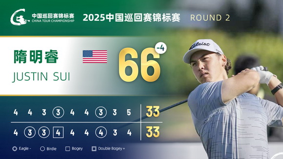 上周刚在红运郎·2025海峡杯厦门公开赛斩获职业首冠,美籍华裔球员隋明睿(Justin SUI)延续了火热状态。他在次轮凭借稳定的一号木和三号木发挥,多数球精准落在球道,为抓鸟创造了有利条件,以5只小鸟、1个博基的成绩交出66杆,两轮以-7与唐海钊、施耐德携手领跑。“上一站夺冠给了我很大信心,今天长杆表现很稳定,基本都能打上球道。”隋明睿表示,尽管推杆仍有提升空间,但整体发挥已超出预期。