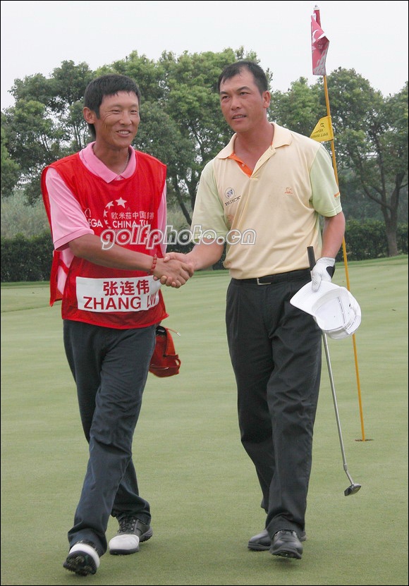 加洞赛张连伟获胜后,伴随他一路走过的“球童”刘斌(左)最感欣慰。(摄影:golftime·阿沛)