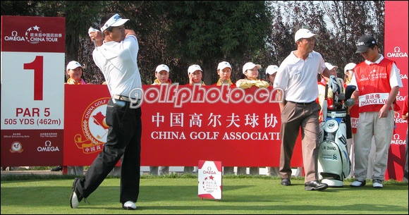 张连伟、郑少光和男子国家队队长樊志鹏同组9:10出发。图为樊志鹏开球。(摄影:golftime·阿沛)