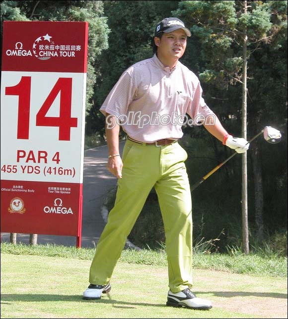 邓裕超今天与贺小岚作为第一组选手8:00准时从1号洞出发。上半场邓裕超发挥不错,分别在第3洞、第6洞和第8洞捉了3只小鸟。由于这个球场相对较短,邓裕超只用了3次1号木,其它都是用铁杆开球,球基本都打上了球道,并且都尽可能的ON上了果岭。下半场,邓裕超打得比较稳定,洞洞力求保par,只在394码par4的第13洞盲洞吃了博基。这个洞可以说是昆明乡村比较有特点的一个洞,短距离的狗腿洞。尽管景致十分吸引人但是却暗藏杀机,发球台到果岭的高度落差很大,而且球道之外还有水障碍作祟。