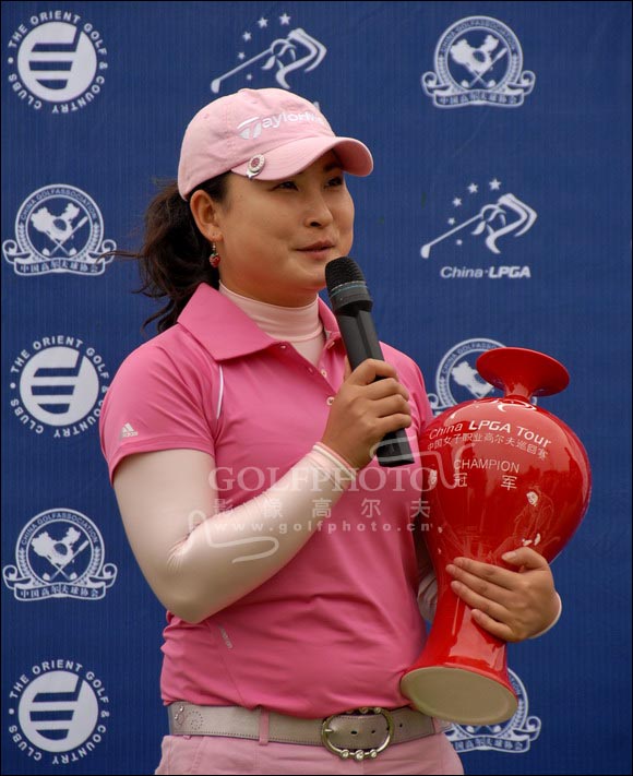 【golftime讯】5月15日26岁选手杨涛丽在北京东方明珠乡村俱乐部最后一洞拿下10英尺小鸟,以5杆优势夺取中国女子巡回赛第一个冠军。带着一杆优势进入最后一轮,杨涛丽星期五打出70杆,低于标准杆2杆,以209杆(68-71-70),低于标准杆7杆的好成绩结束了三轮角逐。从第一轮领先到最后一轮,杨涛丽最终以5杆优势战胜2007年冠军普兰妮(Porani Chutichai),夺取了北京东方明珠锦标赛冠军。这是杨涛丽在东方名人巡回赛上拿到6个亚军之后第一次在东方的连锁球场上取得胜利。更有历史意义的是:这是中国女子巡回赛第一个赛季的第一场比赛。