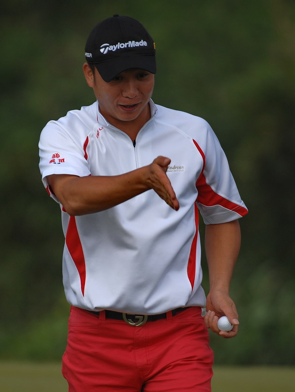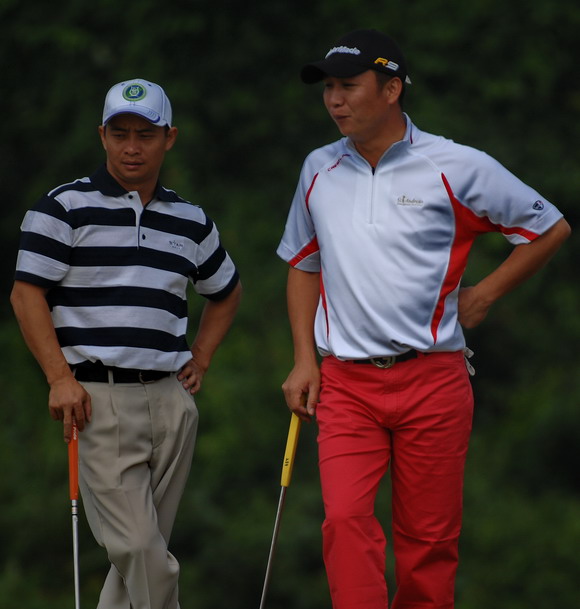 中国职业选手袁浩和体操名将李小双今天搭档比赛,他们全场收获8只小鸟,没有吞下一个博基,完成65杆位居单独第二名。今年获得职业锦标赛北京站冠军的袁浩表示,他今天没有发挥出状态,如果打得好的话可以完成-4杆,他今天个人成绩-1杆,位居并列第三名。李小双也是一位业余高手,差点在4到6之间,他表示自己今天没有抓太多鸟,希望明天打好。