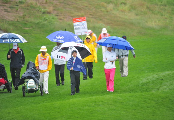 国家队女子选手黎佳韵(前排中)第三轮雨中打出71杆,三轮以5杆优势领先独秀。