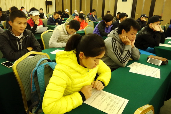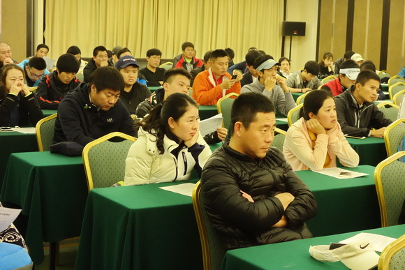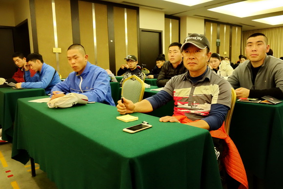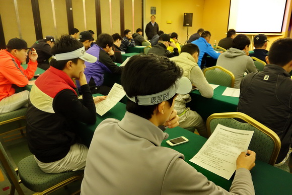 【golftime讯】2016年中国高尔夫球协会规定,2016年中国高尔夫球协会专业会员之职业运动员入会测试,2月21-26日在珠海金湾高尔夫球会举行。共有符合规程规定的62名男子选手、27名女子报名/签到参战。在22日晚召开的全体选手会议中,小球中心奥保部副部长、中国第一位获得R&A规则委员会通过资格的国际级裁判钟民,中高协副秘书长宋亮亮出席并做重要讲话,裁判长郭平为选手做比赛时的当地规则讲解,并对即将在24日进行的高尔夫球规则以及相关知识考试,提纲携领的培训和答疑解惑。 (编辑/摄影:golftime·阿沛)