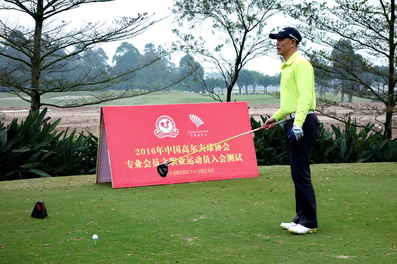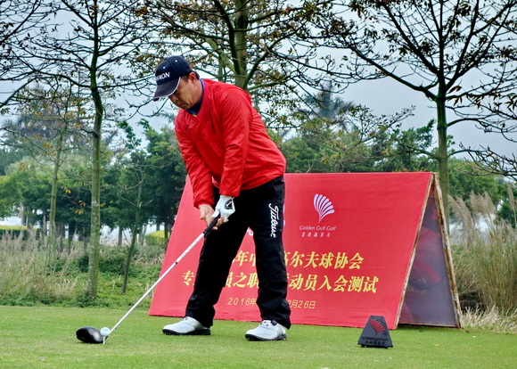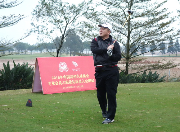 来自山东龙口48岁的湛灿洪,是1号洞为本次职业考试第一个开球的选手。 作为业余选手他在各种业余比赛中成绩斐然,也曾出现在往年的职业考试名单之列。
