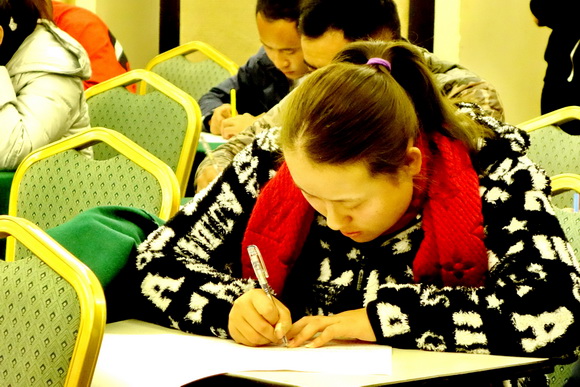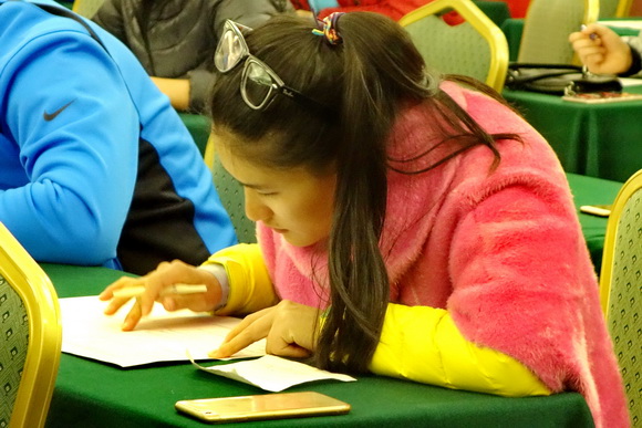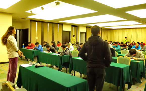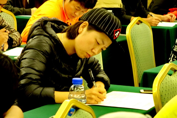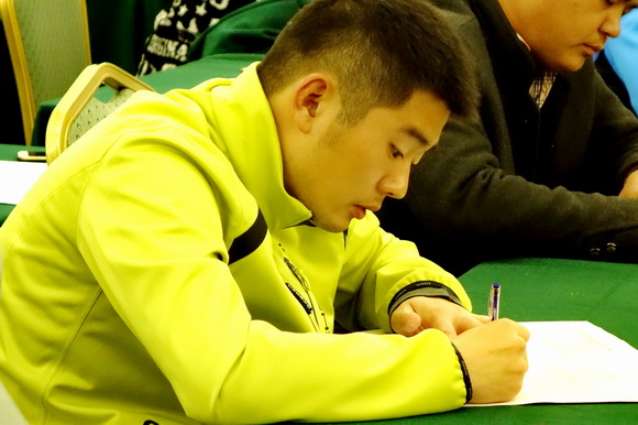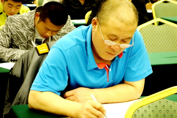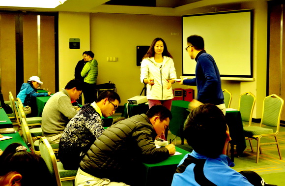 从发放考卷到开始答题,会者不难,难者不易。但是只要平素对规则有足够重视和掌握,在以往的高尔夫球比赛中能够学以致用、融会贯通,在22日晚全体人员会议中,仔细听裁判长郭平的讲解和辅导并认真做了笔记和复习,取得通过易如反掌,获得高分也顺理成章。反之则只能“呵呵”了。有趣的是,就有选手在某项答题后边,还写了“哈哈哈”三个字。在第20分钟时一位男选手上交了考卷,1分钟后一位女选手也上交了答卷,有3位选手坚持到最后第6分钟交卷。