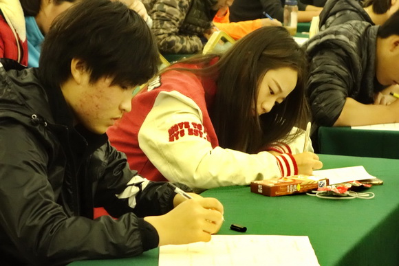 18岁的李佳雯(右)和比自己大半岁的李茜娅同桌“竞考”。  上海体院的大学生方巴斯滕在答题中。