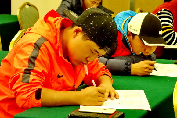 在选手答题过程中的考场秩序井然、纪律严明,堪称完美。面对考题有人洋洋洒洒下笔千言,有人抓耳挠腮上火万分。有人因提笔忘字着急,有人急中生智用拼音代替,有人通篇以韩文作答,而来自海口的女子选手新西兰“海归”马赛用90%的英文答卷,据现场的国际级裁判(去年初在英国考取)沈子达初阅,不少答题表述是R&A规则小册子上的原文。可见她的重视态度和掌握规则程度,与所受到的高尔夫教育息息相关。