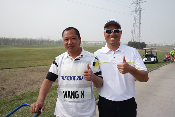 第一回合王煦开球偏左入长草,第二杆救球成功上果岭,一记长推入洞捉鸟先声夺人,与球童庆贺胜利。