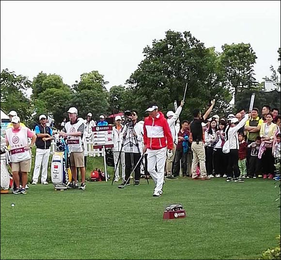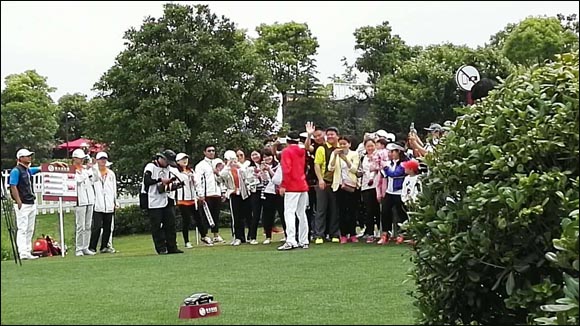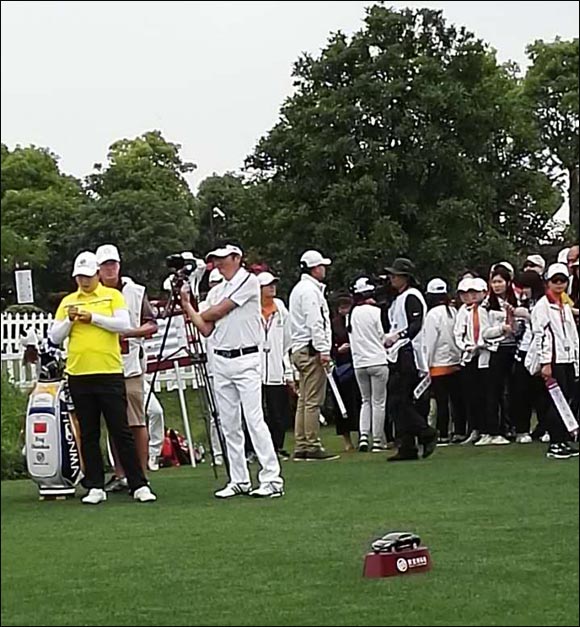 【golftime讯】别克锦标赛5月14日在上海旗忠花园高尔夫俱乐部进行第三轮比赛。两轮的比赛结束后,本场比赛最大的两颗明星——“中国本土大满贯第一人”冯珊珊和“美巡人气女神”崔罗莲在分别打出66杆和68杆后,并列处于领先榜首位,而排在第三位的是与她们一起征战LPGA的好伙伴林希妤。今天的第三轮比赛,冯珊珊与崔罗莲将连续第三天同组,而与她们同组的其中一名业余选手是中国著名歌手孙楠,可想而知这一组的关注度有多高。周六上午10:34分,这组球员来到1号洞发球台,因为人气职业选手和人气业余选手都聚在一组,1号洞发球台周围有很多观众。孙楠一出现,观众们都热情的喊他的名字,他也与观众们击掌互动,毫无明星的架子。 (编辑/摄影:golftime·陈艳)