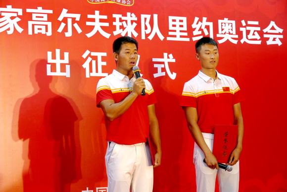 【golftime讯】高尔夫今年进奥运会了,对于高尔夫球运动而言,这是112年以来的第一次;对于中国高尔夫球运动而言,这是破天荒头一次。下个月,巴西里约热内卢,高尔夫球将重返奥林匹克大家庭。而随着中国奥委会向国际奥委会正式确认冯珊珊、林希妤、吴阿顺、李昊桐四位运动员组成本届奥运会的中国高尔夫球队,中国高尔夫球运动即将书写新的篇章。7月25日,在北京体育大学国家训练基地,由国家体育总局小球运动管理中心、中国高尔夫球协会主办,比音勒芬服饰股份有限公司、深圳市比奇汉商贸有限公司协办的中国国家高尔夫球队里约奥运会出征仪式隆重召开,为中国高尔夫的的九位高尔夫代表壮行。中国队由9人组成,除以上四名运动员外,小球中心主任、中高协副主席张小宁担任领队,球童是李近高、Yakumaru Ryuichi、Mercer Leftwich III、Mardi Lunn。中国男队将于7月29日先行赴圣保罗训练营,8月4日进驻奥运村,11-14日比赛。女队将于8月3日在北京集结,7日赴圣保罗训练营,12日进驻奥运村,17-20日比赛。运动一部部长金宏文、副部长韦庆峰将随同男队一起开赴圣保罗训练营开展赛前训练。