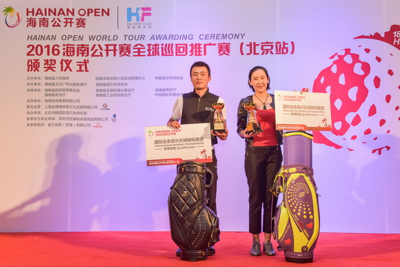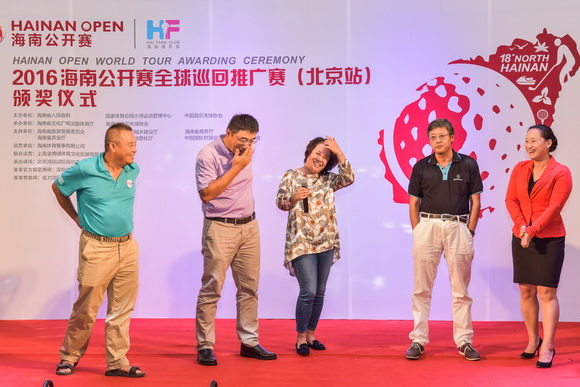 颁奖之余,组委会还为前来比赛的球友们准备了丰富多彩的礼品用于抽奖,在抽奖环节中,获得“海南三天两晚两场球旅游套票”大奖的两位幸运儿分别是:彭嵩和李庆章;颁奖晚宴的高潮出现在争夺“2016海南公开赛暨欧洲巡回挑战赛职业/业余配对赛的参赛资格”这一环节中——海南公开赛执委会秘书长唐莉萍女士在现场颁布赛题:“谁能说出海南省球场名字最多的现场“海粉”,谁就将获得这一殊荣”。赛题一经颁布,立刻引起了现场的积极回应,经过了数轮较量,最终,赵建平和谭强在争夺中不分伯仲,共同获得了这一殊荣。