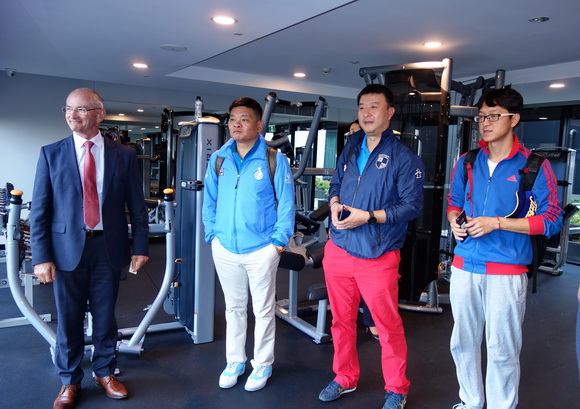 总经理博勒先生带媒体参观酒店会议室、客房和设施齐全的健身房。