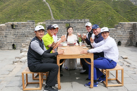 挥杆长城之后,球星们还品茗了中国功夫茶。源自广东、福建的功夫茶则让这些平日在球场上龙争虎斗的球星们放下球杆,坐而论道。置身古老的烽火台,由专业茶艺师的引导讲解,在座的中外球星们立即被古老的茶文化所吸引。来自福建的吴阿顺更是为能推介家乡的茶文化自豪不已。随后,他们两两举杯对饮品尝茶艺师冲泡的福鼎白茶,象征着东方的茶文化与源自西方的高尔夫文化的融合。