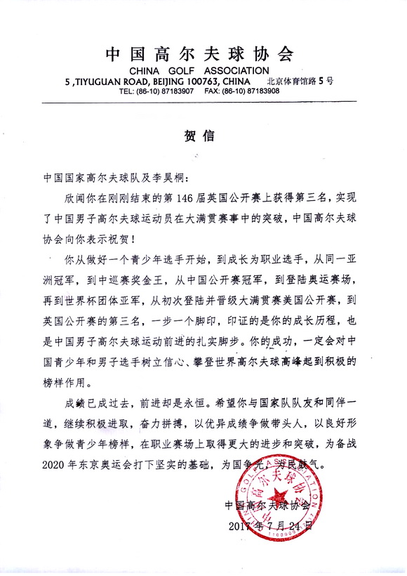 欣闻你在刚刚结束的第146届英国公开赛上获得第三名,实现了中国男子高尔夫球运动员在大满贯赛事中的突破,中国高尔夫球协会向你表示祝贺!