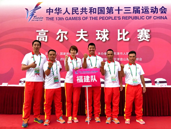 【golftime讯】中华人民共和国第十三届运动会高尔夫球比赛项目,9月1日在天津盘山高尔夫球会举行参赛代表队入场仪式,14支参赛代表队领队、教练、队员,全体裁判员精神抖擞,闪亮登场。东道主天津队潘艳红代表运动员宣誓,裁判长冯力源代表裁判员宣誓。随后各队的大合影环节充满战斗气息和欢乐气氛。大赛一触即发,2—5日四轮比赛哪个参赛队将捧起团体冠军奖杯?等着瞧。 (摄影/报道:golftime·阿沛)
