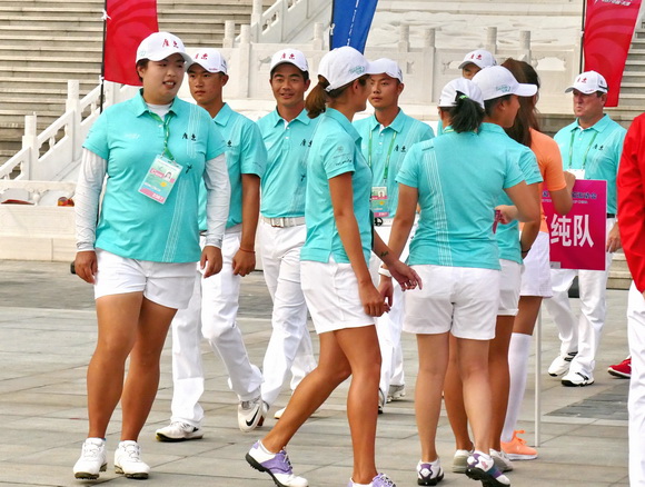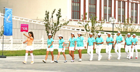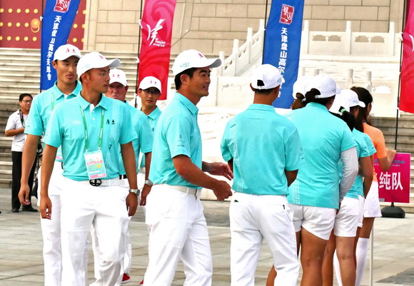 【golftime讯】中华人民共和国第十三届运动会高尔夫球比赛项目,9月1日在天津盘山高尔夫球会举行参赛代表队入场仪式,14支参赛代表队领队、教练、队员,全体裁判员精神抖擞,闪亮登场。东道主天津队潘艳红代表运动员宣誓,裁判长冯力源代表裁判员宣誓。随后各队的大合影环节充满战斗气息和欢乐气氛。大赛一触即发,2—5日四轮比赛哪个参赛队将捧起团体冠军奖杯?等着瞧。 (摄影/报道:golftime·阿沛)