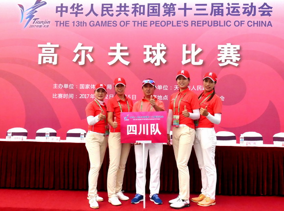 【golftime讯】中华人民共和国第十三届运动会高尔夫球比赛项目,9月1日在天津盘山高尔夫球会举行参赛代表队入场仪式,14支参赛代表队领队、教练、队员,全体裁判员精神抖擞,闪亮登场。东道主天津队潘艳红代表运动员宣誓,裁判长冯力源代表裁判员宣誓。随后各队的大合影环节充满战斗气息和欢乐气氛。大赛一触即发,2—5日四轮比赛哪个参赛队将捧起团体冠军奖杯?等着瞧。 (摄影/报道:golftime·阿沛)