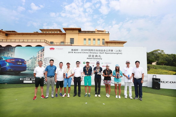 7月26日下午三点,雅阁杯·2018中国高尔夫球业余公开赛上海站颁奖典礼盛大举行,广东省高尔夫球协会副主席兼秘书长、广东省高尔夫球运动中心主任冯雄,广东省高尔夫球协会副主席、广东中奥国际体育推广有限公司董事长王超锋,广汽本田汽车销售有限公司第一事业本部销售部上海商务中心系长王东,广东省高尔夫球协会副秘书长兼竞技体育部部长贾晓峰、雅居乐米克尔森国际俱乐部总经理戴庆佳等领导嘉宾出席活动,共同见证获奖选手的荣誉时刻。