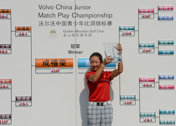 2015年殷若宁在沃尔沃青少年比洞赛高举冠军奖杯。